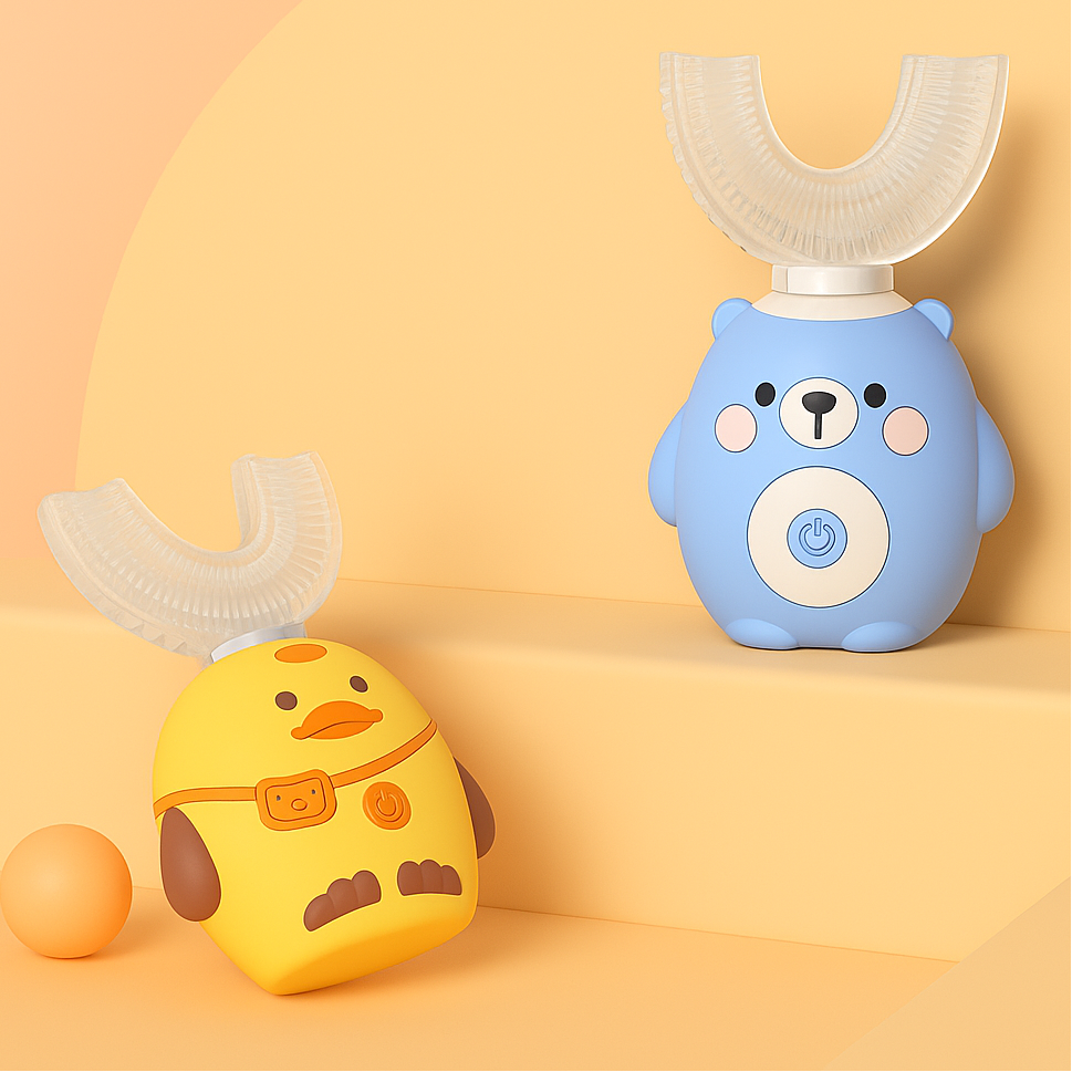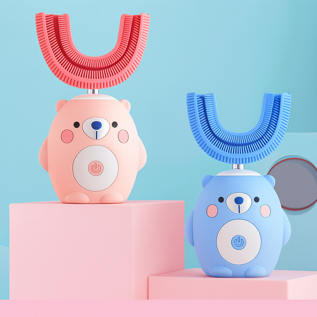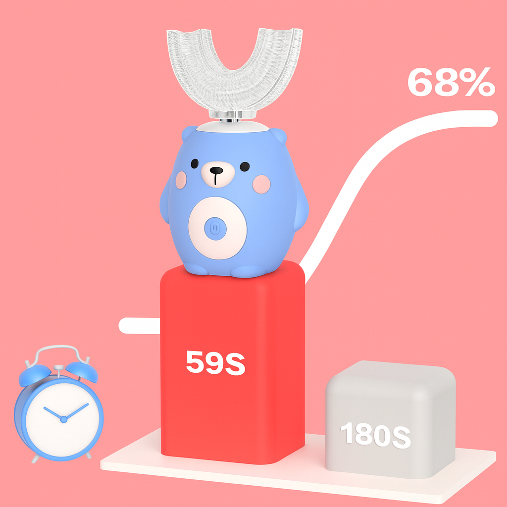 Our U-shaped kids’ toothbrush cleans every tooth in 59 seconds , soft, safe.