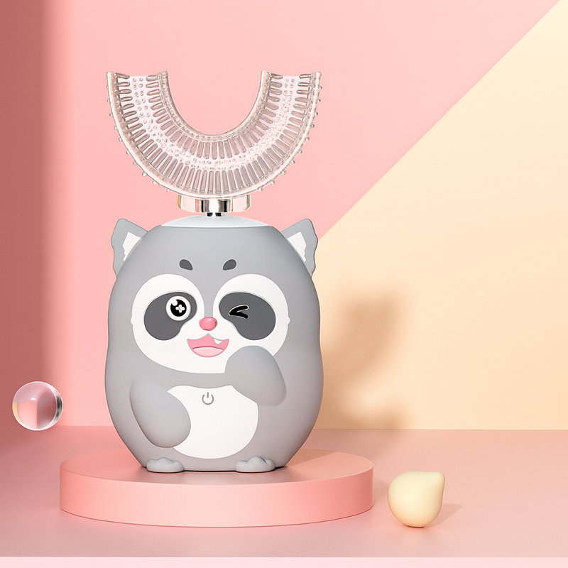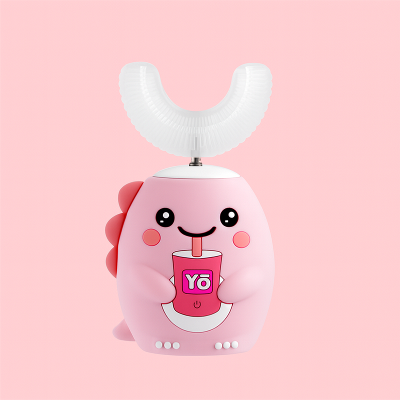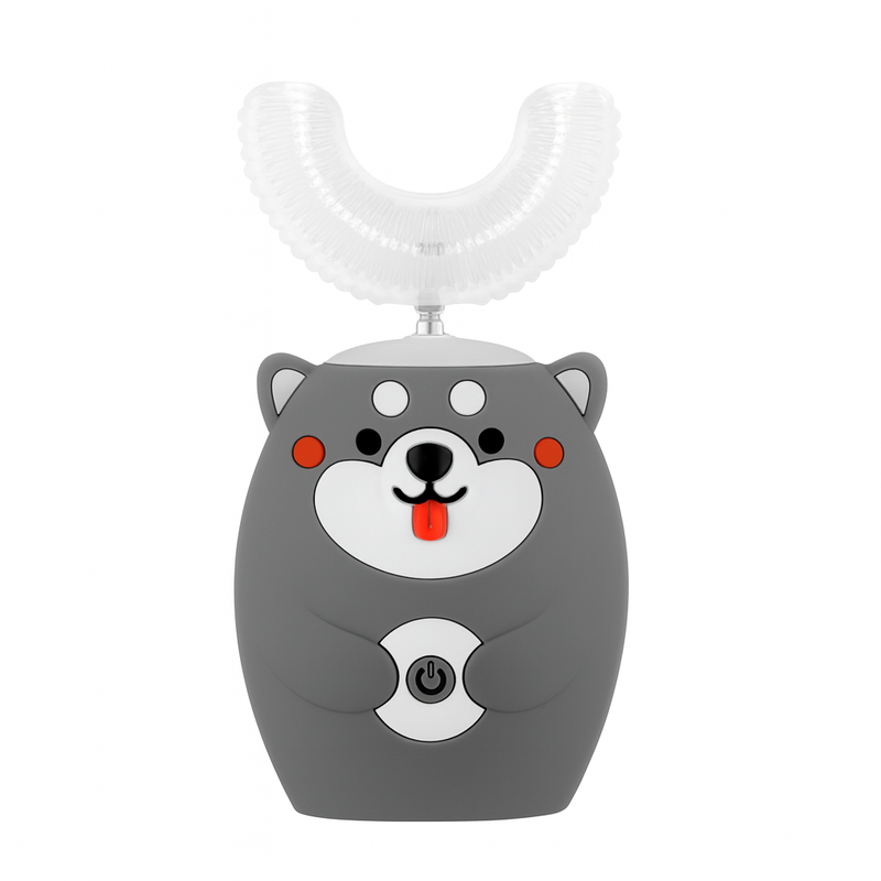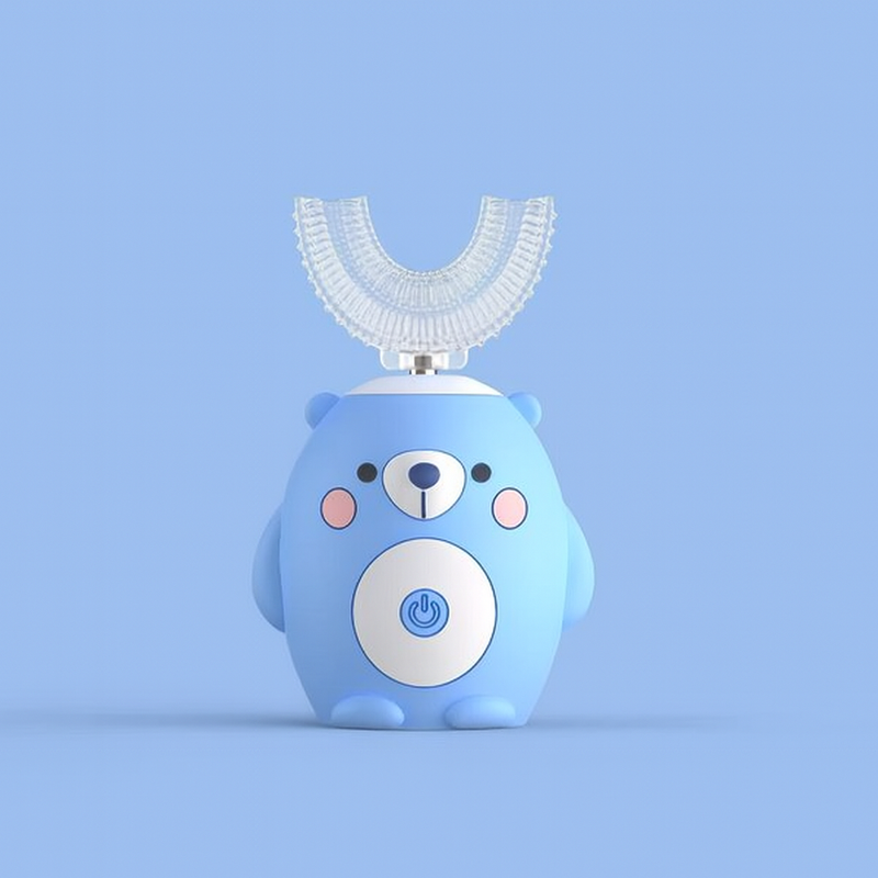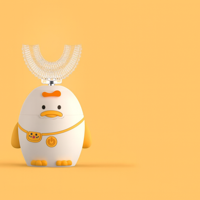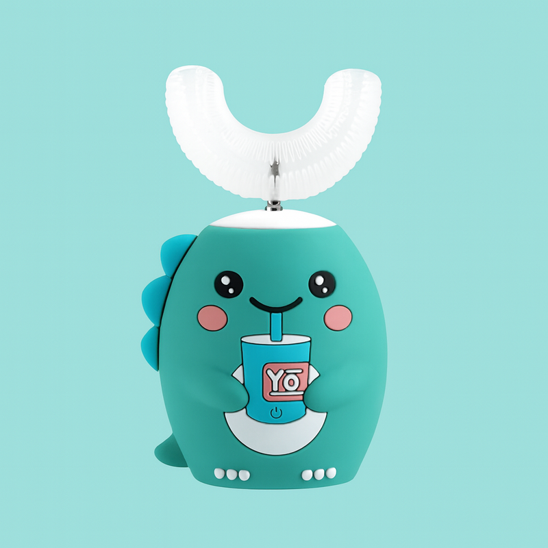 Our U-shaped kids’ toothbrush cleans every tooth in 59 seconds , soft, safe.